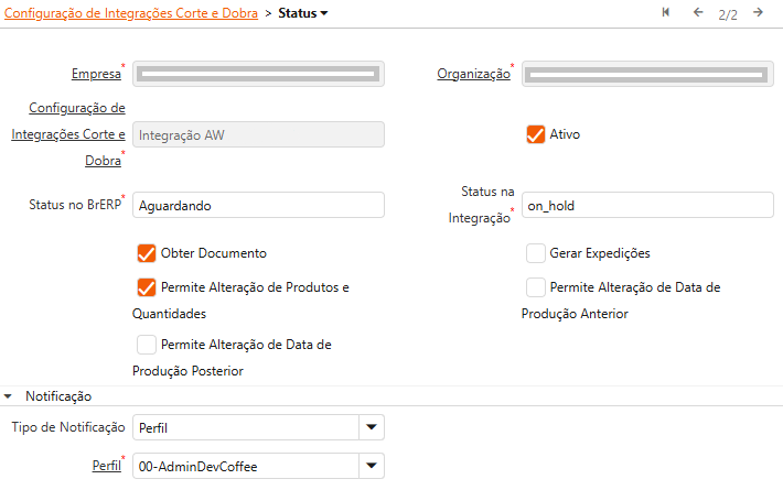 | Status na Integração | O nome do status no AW.¹ | Informar o status que será recebido pelo AW que corresponderá com o "Status no BrERP" |