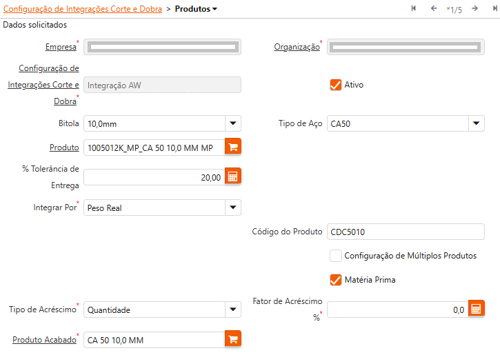 Configuração de Integrações Corte e Dobra