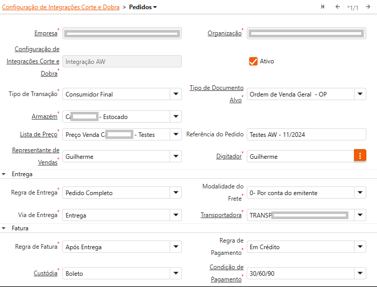 Os valores definidos na aba “Configuração de Integrações Corte e Dobra > Pedidos” são utilizados na integração de ordens de venda. Nesta etapa da configuração, devem ser definidos os valores padrão para serem utilizados nestes registros que serão futuramente integrados.