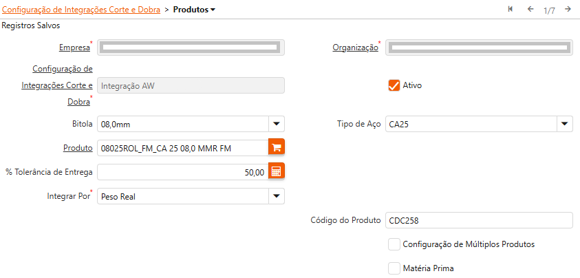 Para a integração de ordens de venda, expedições e progresso da ordem de venda, os produtos do AW devem ser vinculados com os do BrERP. Esta configuração é feita na aba “Configuração de Integrações Corte e Dobra > Produtos”. A tabela a seguir mostra a função de cada um dos campos presentes nessa aba: