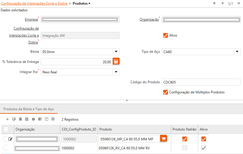 Quando o campo “Configuração de Múltiplos Produtos” é verdadeiro, a sub-aba “Configuração de Integrações Corte e Dobra > Produtos > Produtos da Bitola e Tipo de Aço” é exibida. Nela, devem ser informados todos os produtos compatíveis com a configuração. As figuras a seguir são exemplos de configurações.