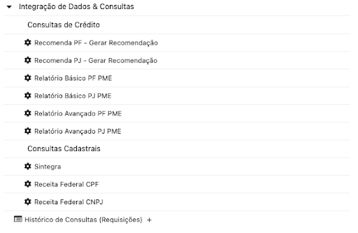 As consultas disponíveis precisam ser liberadas nos perfis da empresa. Para facilitar esta configuração, abaixo está a chave de busca de cada processo e seu nome/descrição:
