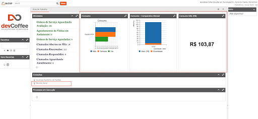 Neste portal do cliente, foram agregadas as funcionalidades de 6.1.3 - Indicadores Rápidos e 6.1.2 - Review Geral. No Review Geral, a única diferença do portal de consumo de clientes que não são de integração nativa é que os relatórios não podem ser reimpressos, pois estão somente disponíveis na janela de Histórico de Consulta (Requisições) do BrERP do cliente. O Review tem propósito estritamente financeiro e de acompanhamento neste cenário.