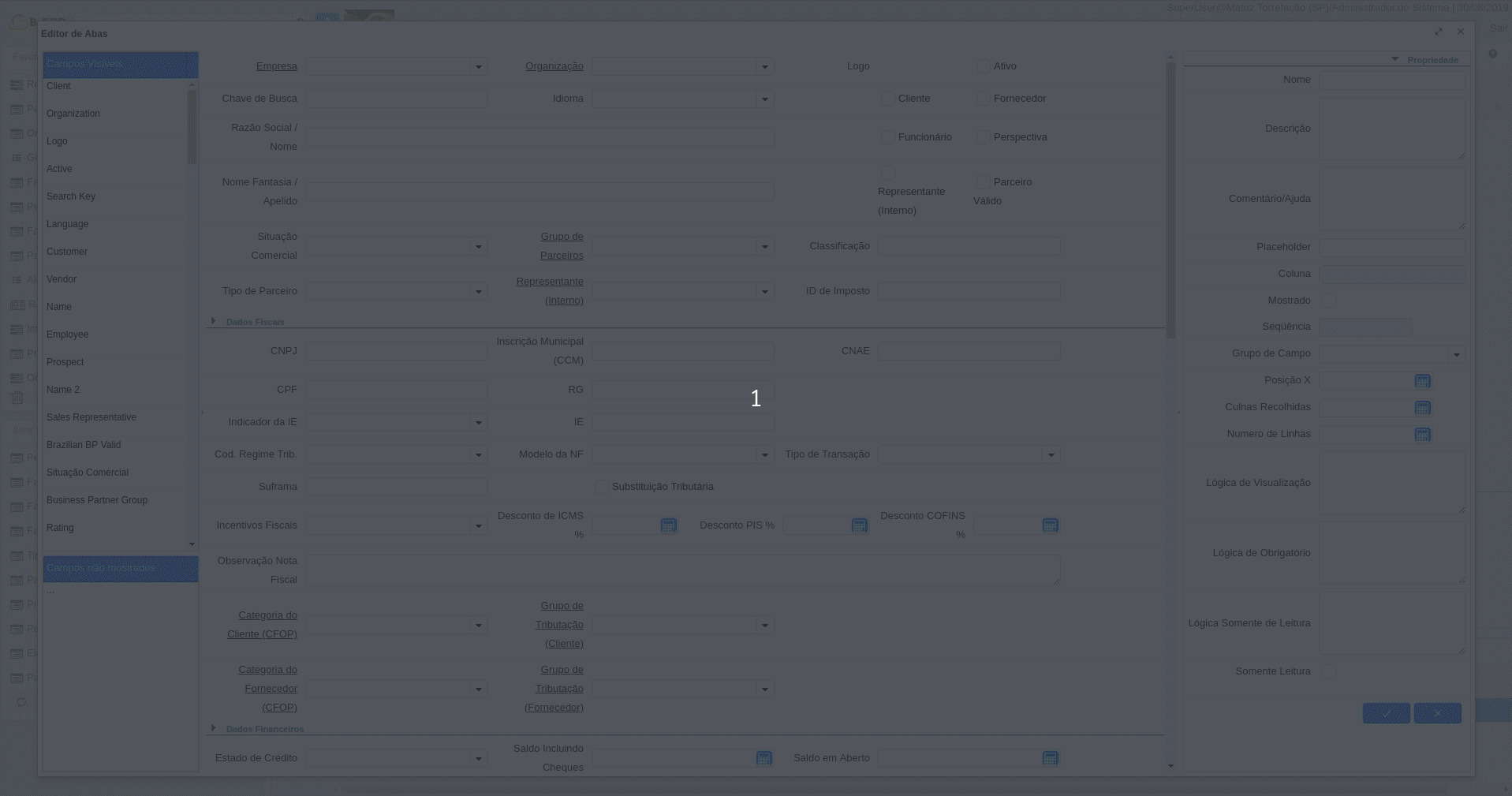 Com o Editor de Abas é possível personalizar as abas das janelas do sistema de forma prática e visual. Com ela é possível arrastar os campos para outras posições, criar e editar grupos de campos, alterar nome, descrição e comentário, entre outras funções que serão apresentadas com mais detalhes nesta documentação.
