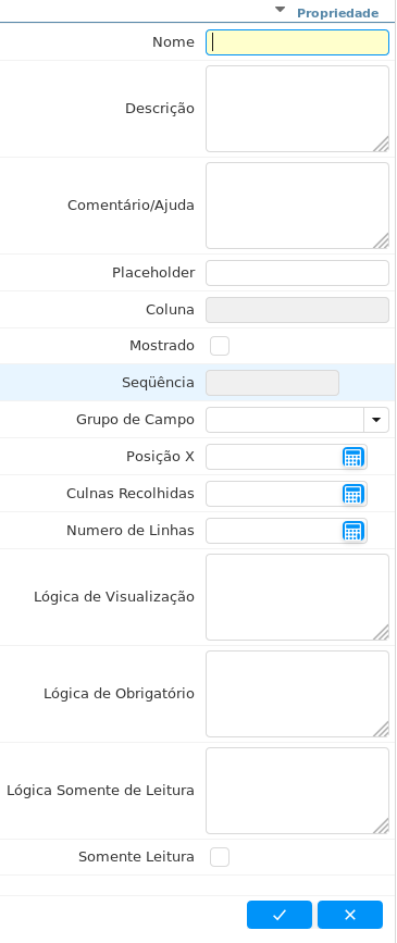 Ao selecionar um campo no Painel Central, as informações pertinentes a esse campo serão mostradas aqui. Pode ser alterado o nome, descrição, ajuda, posição, lógicas de visualização, obrigatório e somente leitura, entre outras opções.
