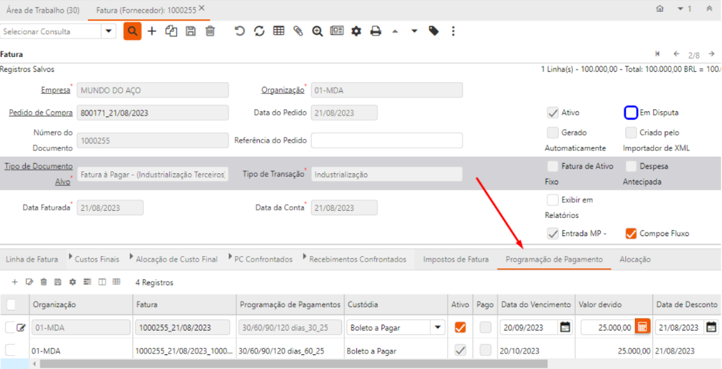 - Acesse a aba Programação de Pagamento em Detalhes de Registro