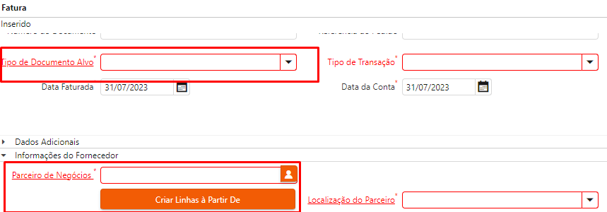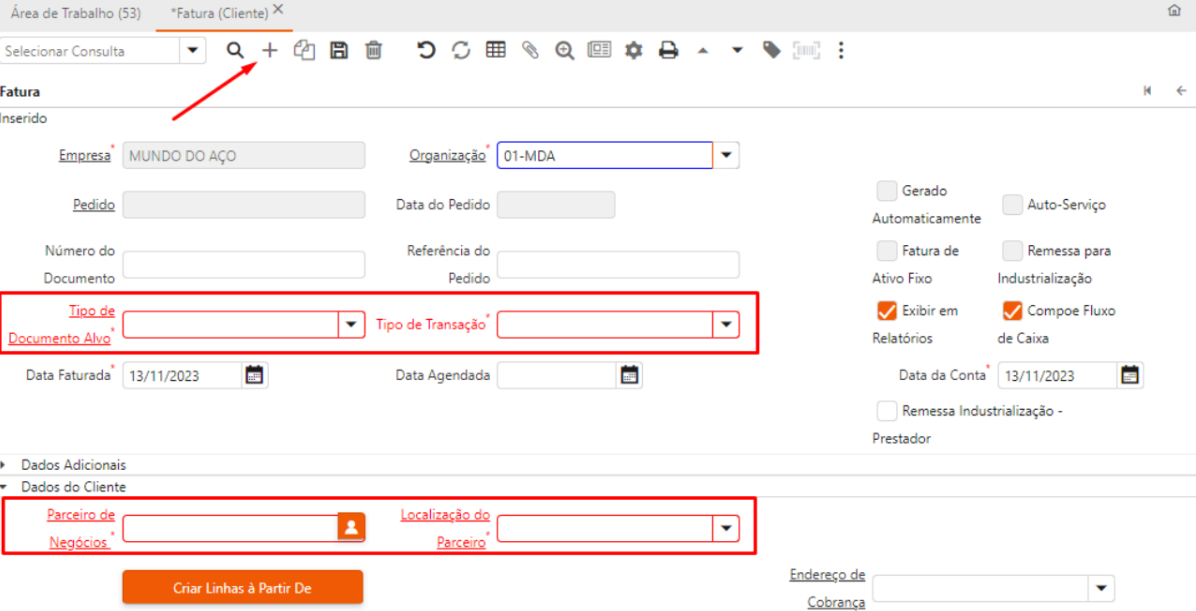 Na janela aberta, crie um novo registro e preencha os campos obrigatórios do Cabeçalho (em vermelho):