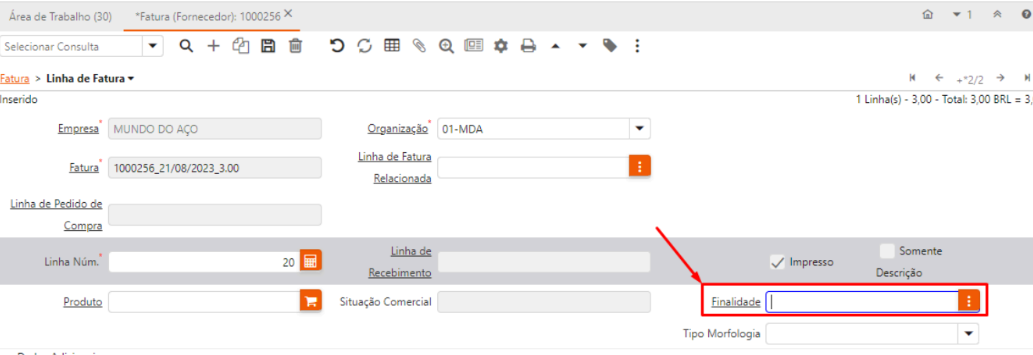 - Cada linha pode conter apenas um produto OU uma finalidade, nunca ambos